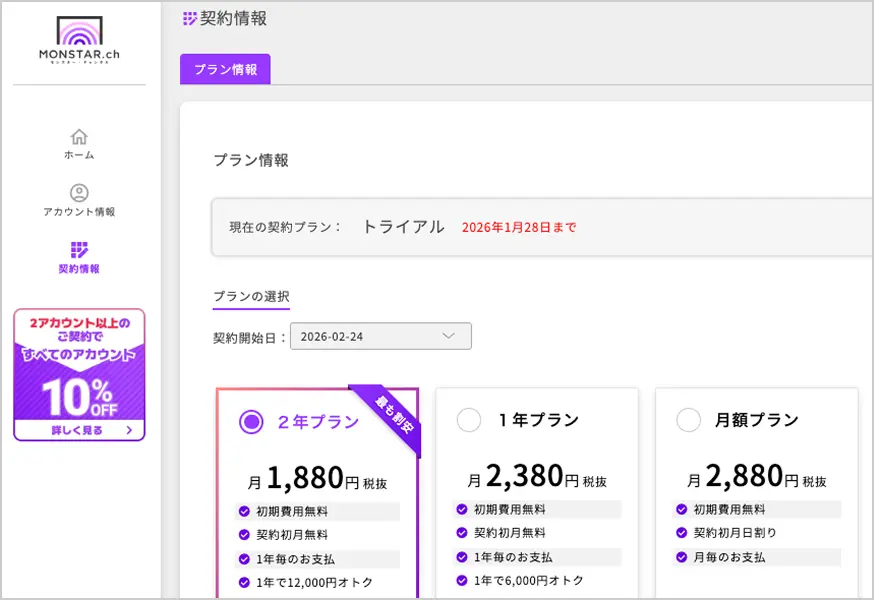 2アカウント以上ご契約いただくと、すべてのアカウントのご利用料金が10%割引となります。